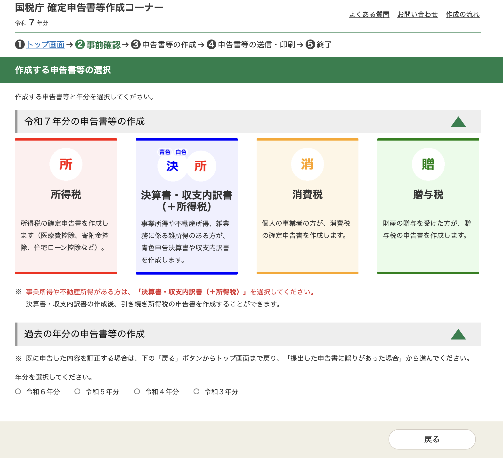 Selecting the スマートフォンを使用するbutton sends you to the next page, to indicate what type of tax filing you're doing. Income tax is the first red button.