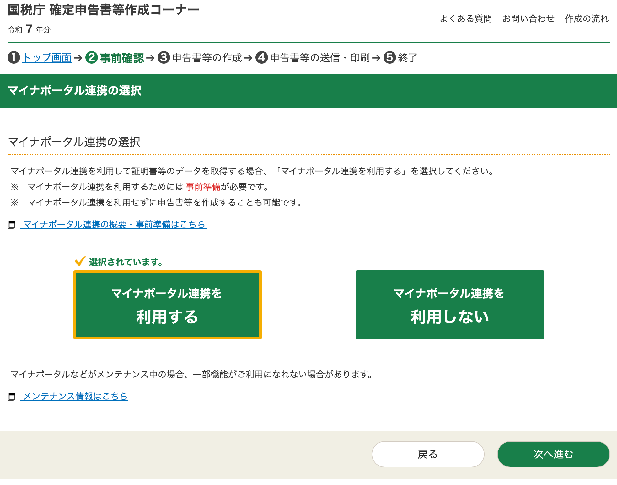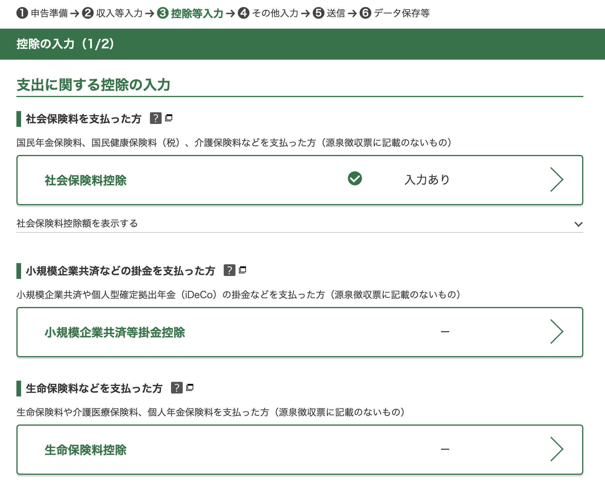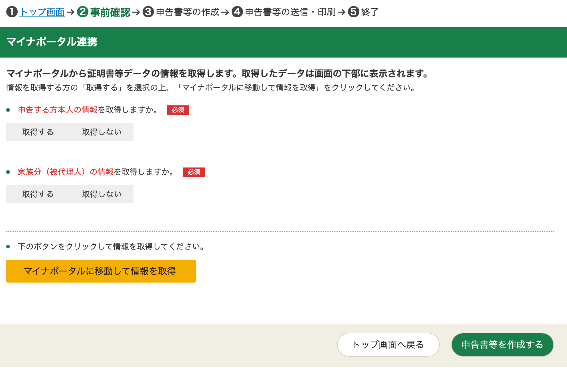 This includes information such as your out-of-pocket medical costs. Select it only if you intend to claim tax deductions from medical bills, property tax, etc. If not, select 取得しない on both boxes, and click the green button at the bottom right.