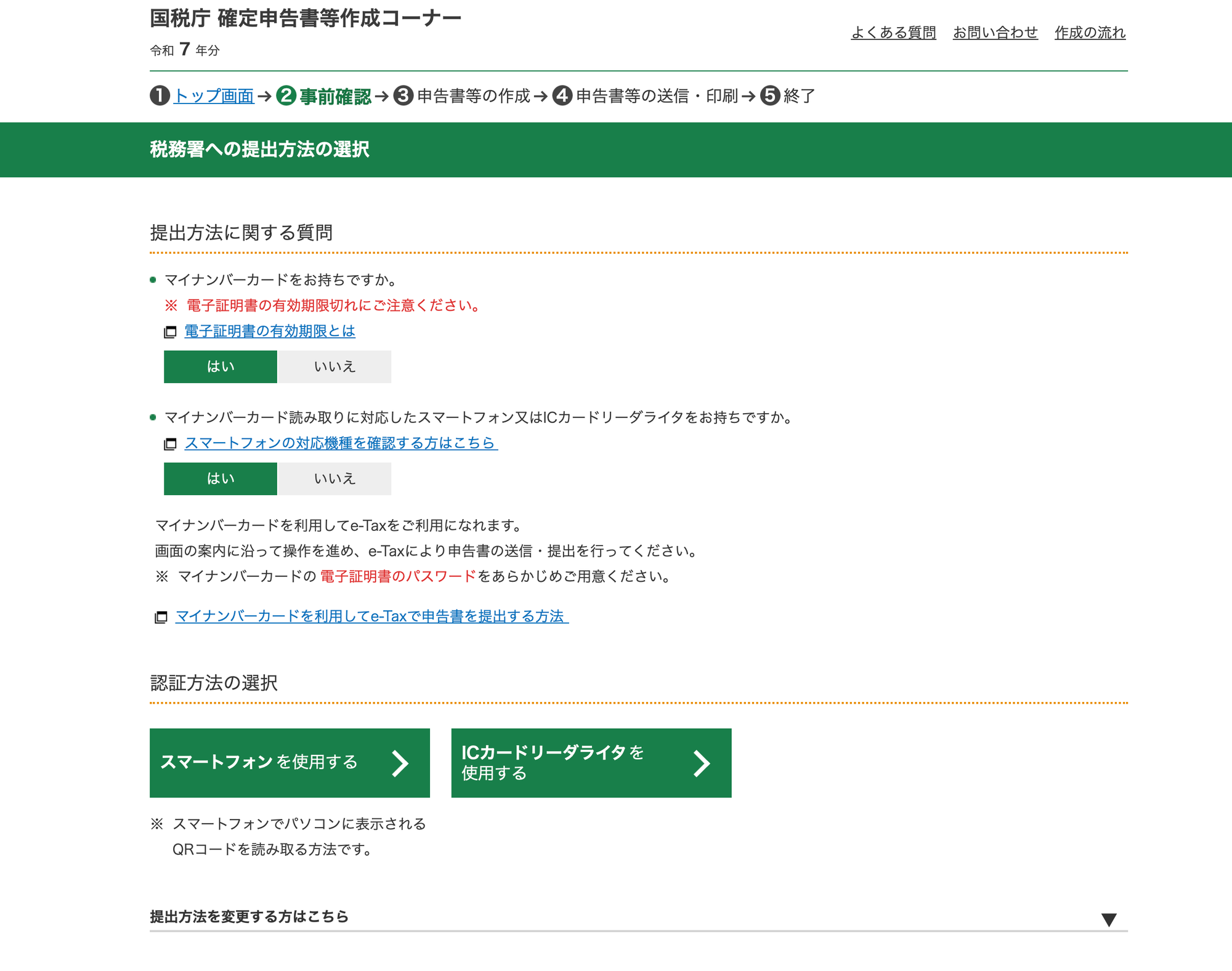 The 2nd question asks if you have a smartphone or IC chip reader that can read your my number card (yes/no).
