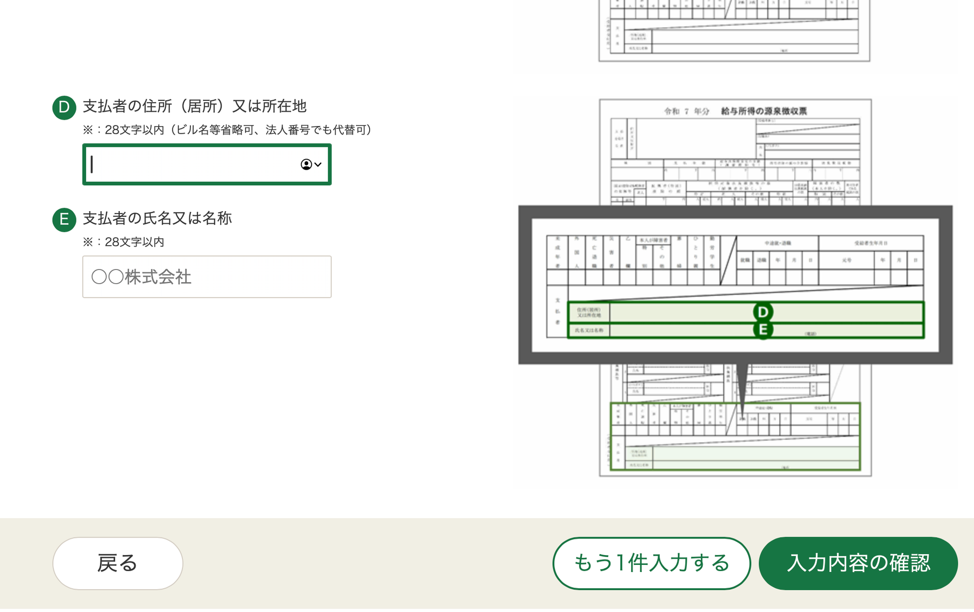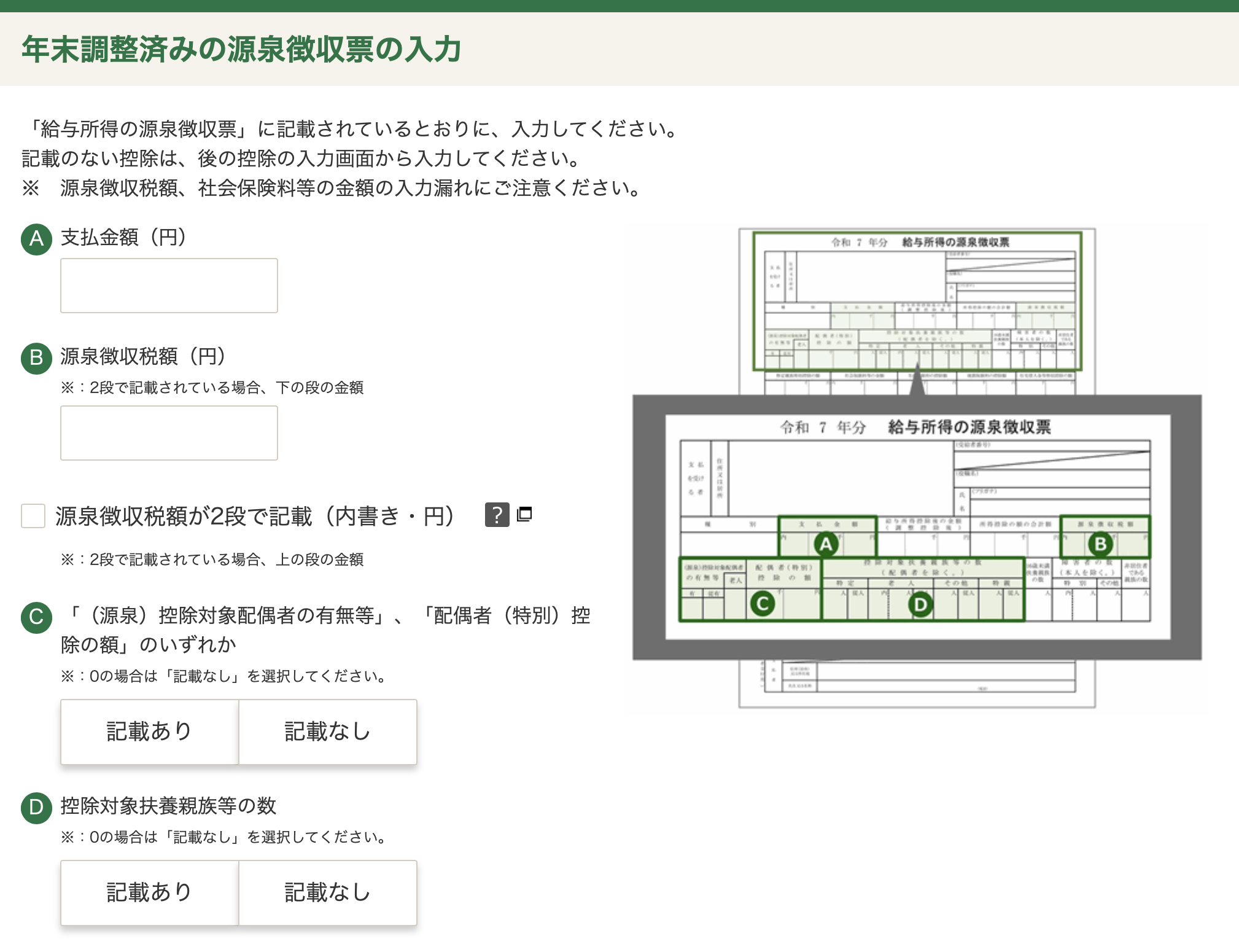 Starting from your salaried portion, the gensenchoshuhyo follows a fixed format. Refer to the images on the page to fill in the appropriate numbers. Follow your gensenchoshu exactly. Additional information can be added later on in the process