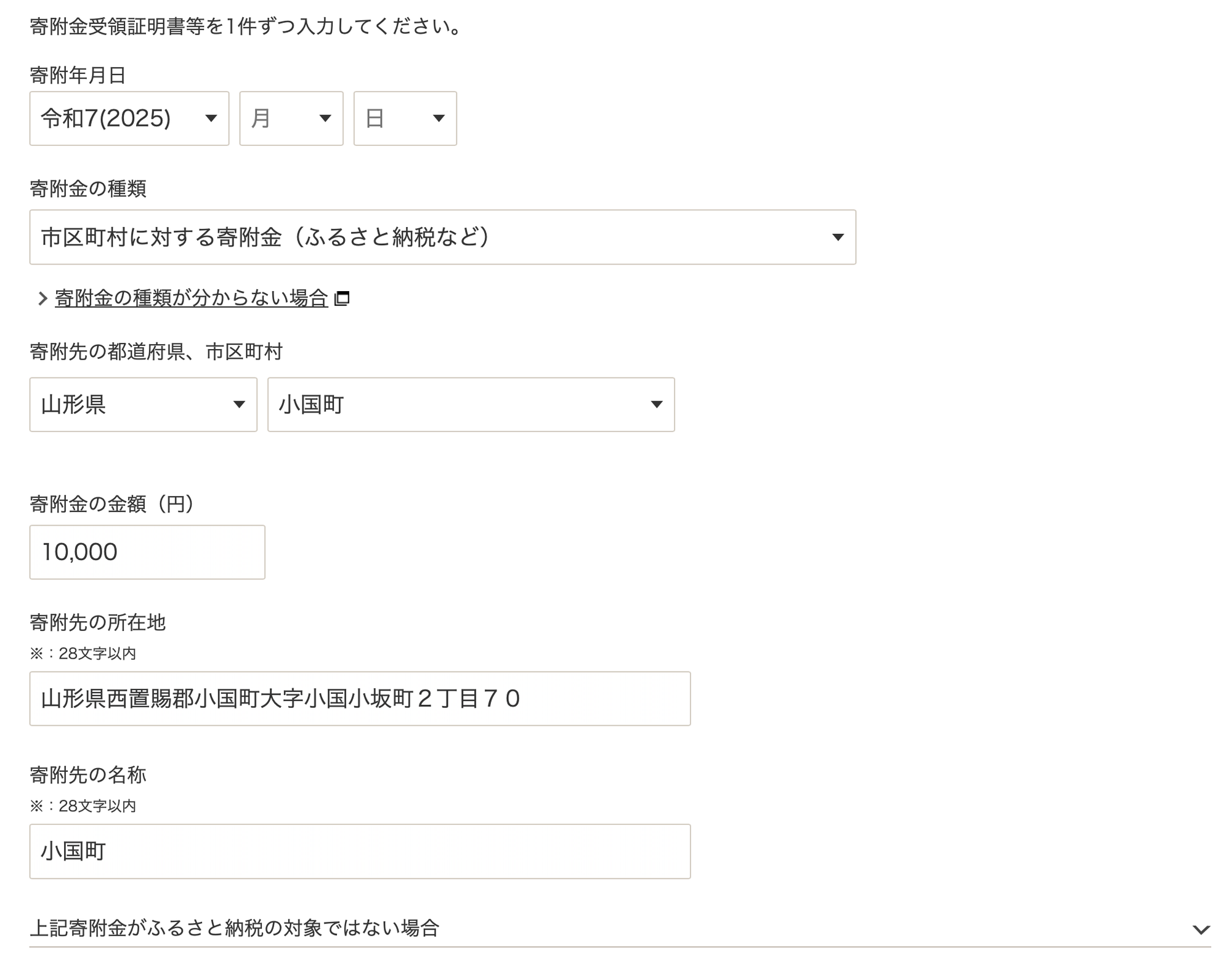 For 寄付金の種類, select the first option, 市区町村に対する寄付金.